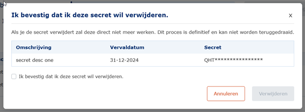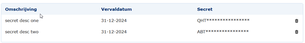 Delete a secret by clicking the trash‑can icon next to the secret on the Authentication page. Confirm the action in the pop‑up window to indicate that you want to remove the secret.